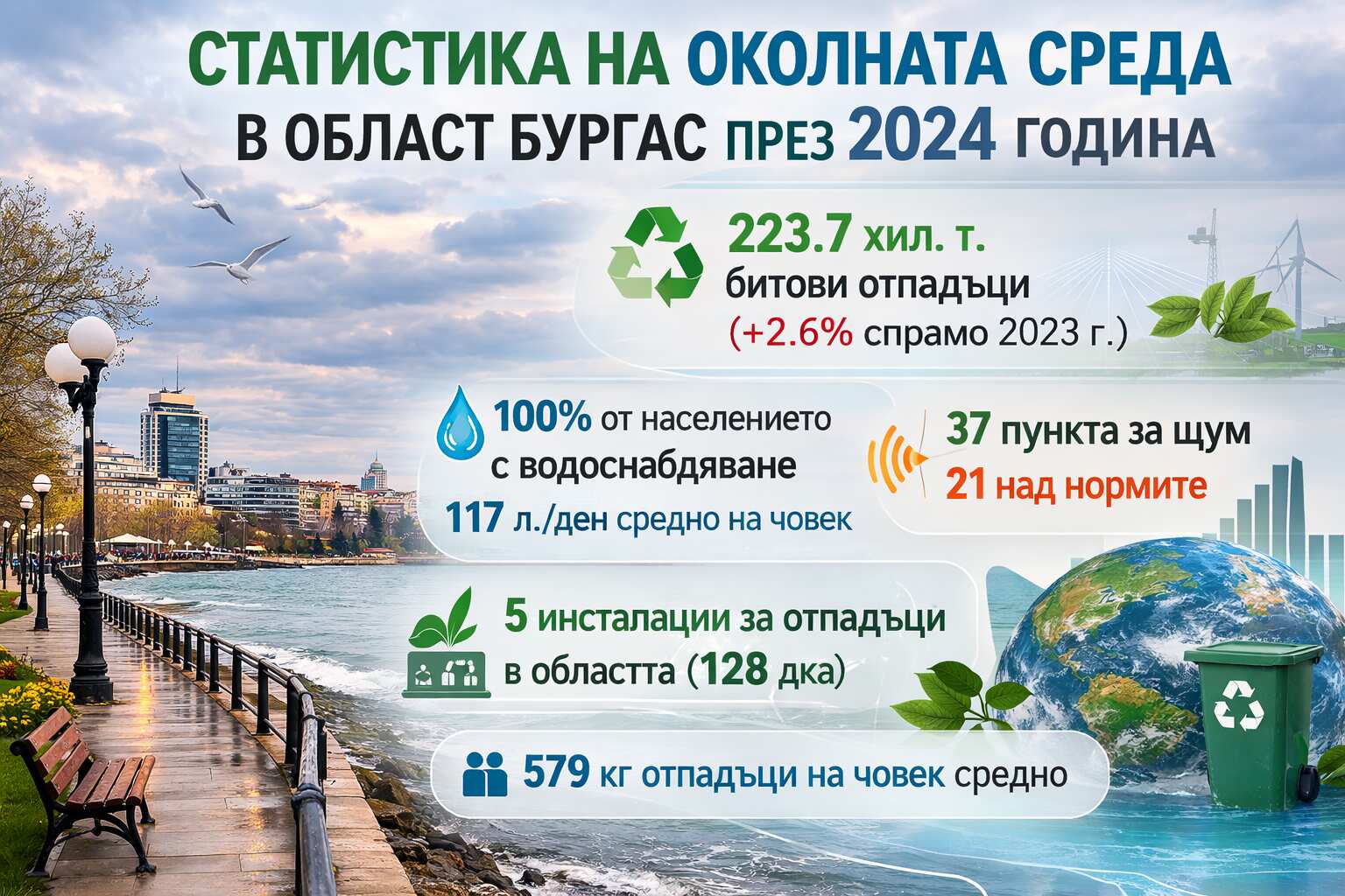 През 2024 г. в област Бургас са образувани 223.7 хил. тона битови отпадъци, което е с 2.6% повече спрямо 2023 г.