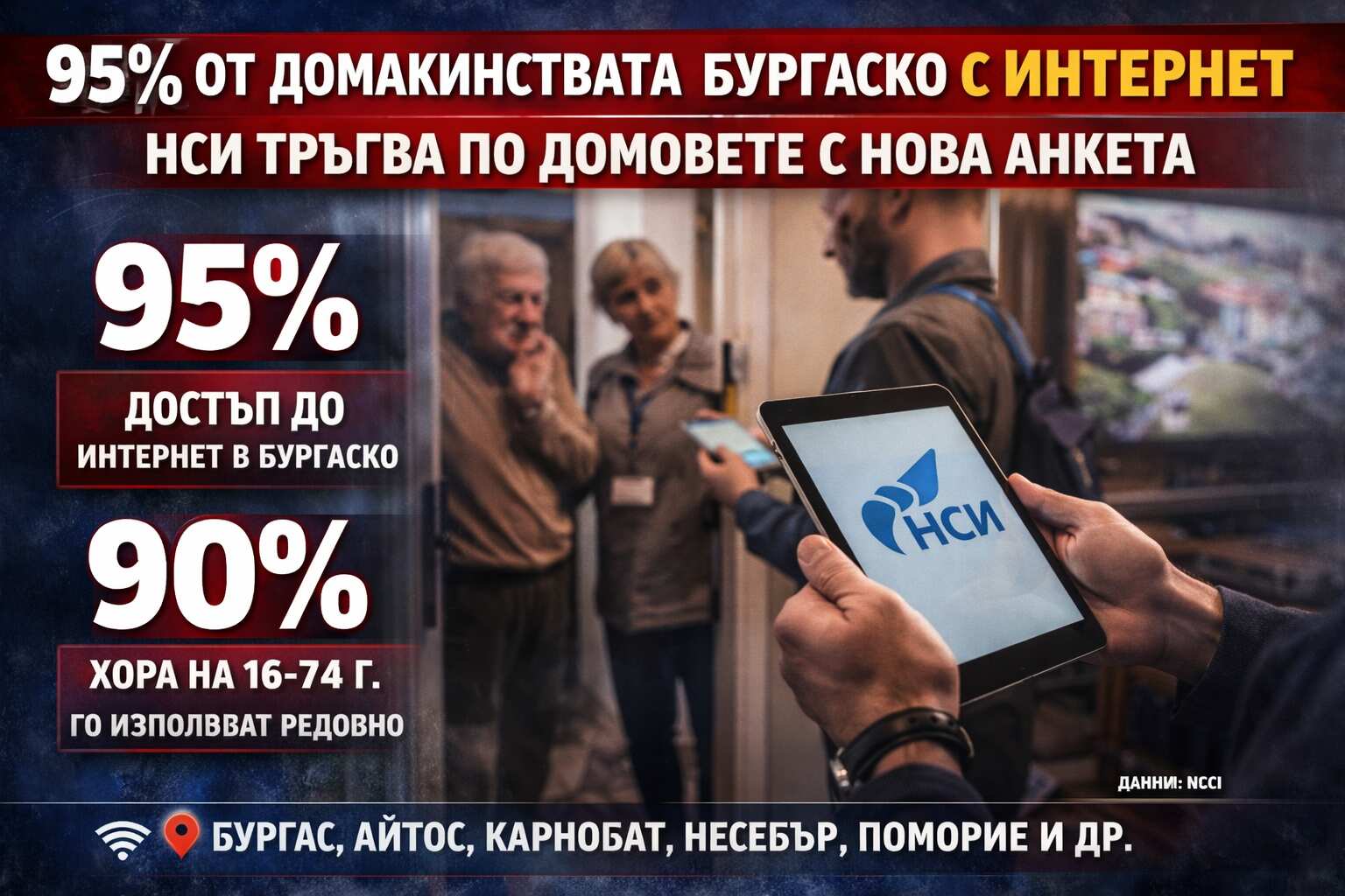 95.1% от домакинствата в област Бургас имат достъп до интернет, а 90.1% от хората между 16 и 74 години го използват редовно. Това показват данните на Националния статистически институт от 2025 г., на фона на ново мащабно изследване, което стартира тази пролет.