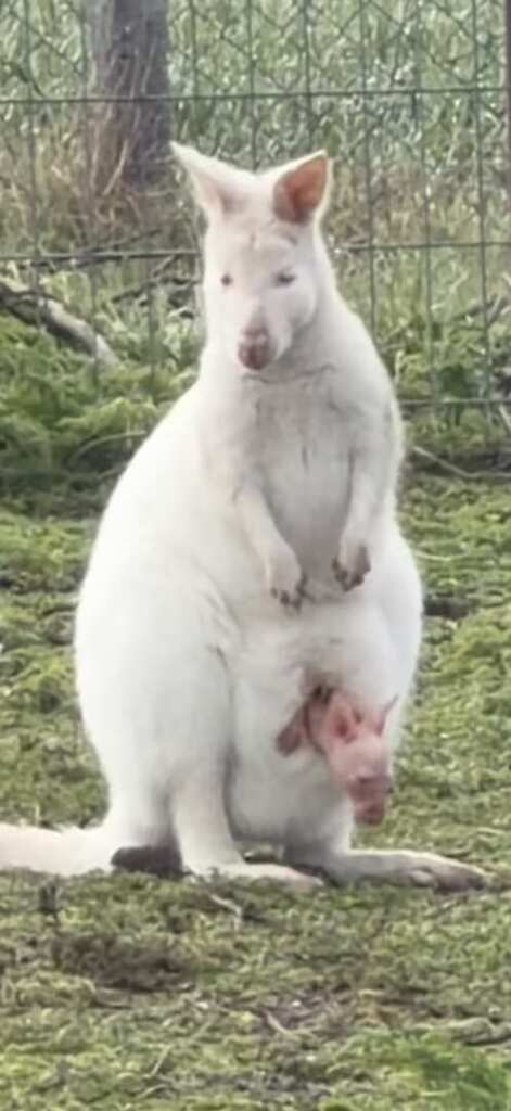 Особено впечатляващо е и бебето кенгуру албинос. Малкото валаби вече започва да се показва от торбичката на майка си, откъдето любопитно наблюдава света. Както при всички кенгура, бебето се ражда изключително мъничко и прекарва първите месеци от живота си в торбичката, където расте и се развива, докато стане достатъчно силно, за да излиза навън.