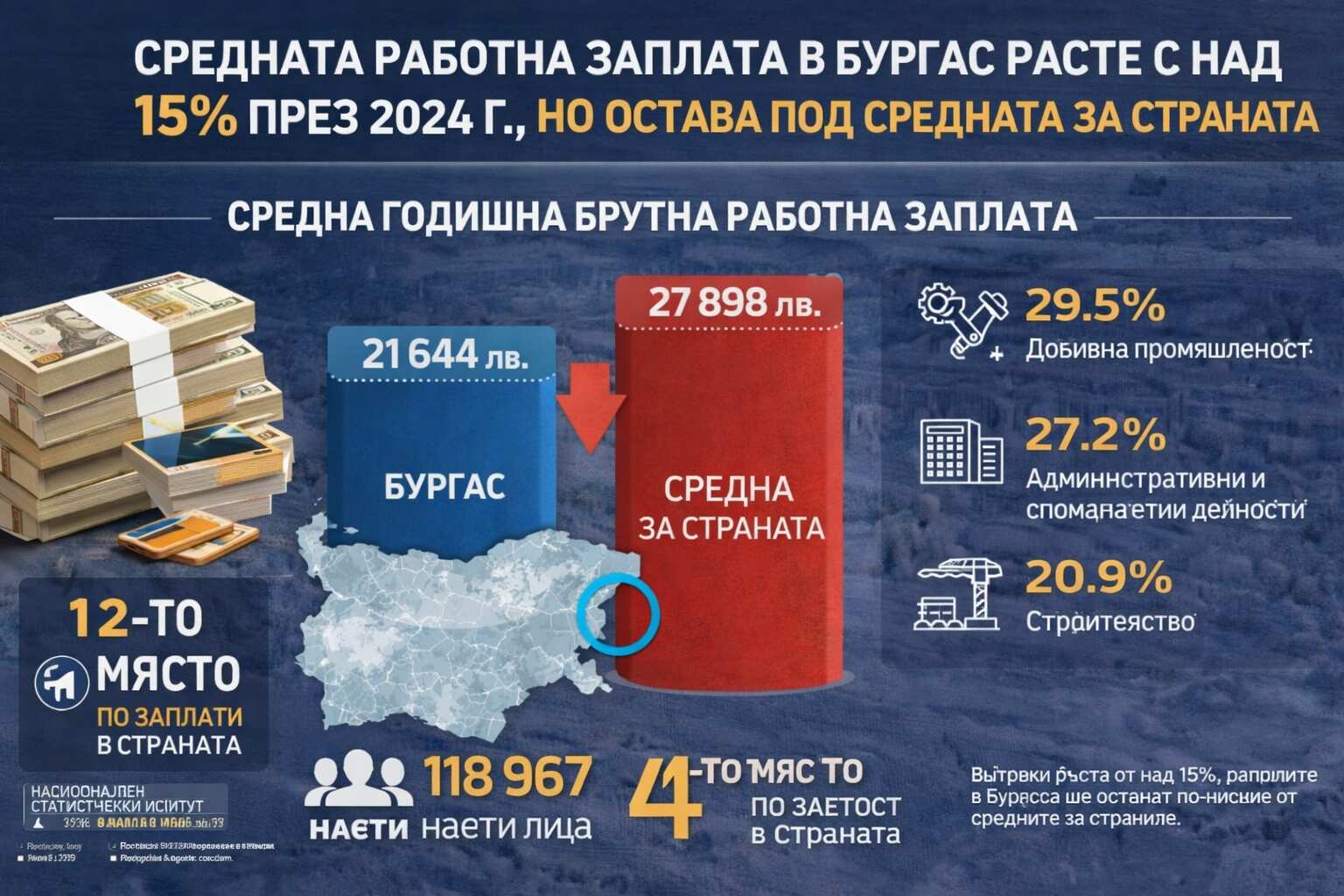 Въпреки устойчивия ръст на доходите, статистиката показва, че Бургас продължава да изостава от националните нива на заплащане, което остава ключово предизвикателство пред регионалния пазар на труда.