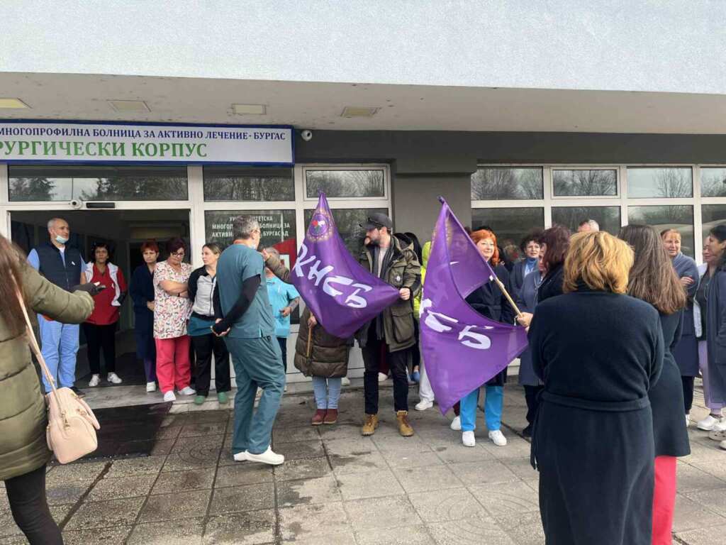Пред УМБАЛ Бургас медицински работници излязоха на протест, част от националните действия, организирани от Българската асоциация на професионалистите по здравни грижи (БАПЗГ). Причината за недоволството са неизпълнените обещания на управляващите за увеличение на минималните възнаграждения на специалистите по здравни грижи и за осигуряване на обществено финансиране на амбулаторните здравни грижи.