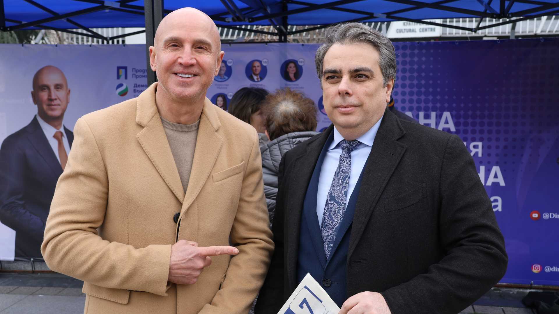 Кандидатът за народен представител от „Демократична България“ Димитър Найденов посрещна на предизборната си шатра на площад „Тройката“ в Бургас председателя на „Продължаваме Промяната“ Асен Василев и водача на листата за Бургаски регион Мирослав Иванов.