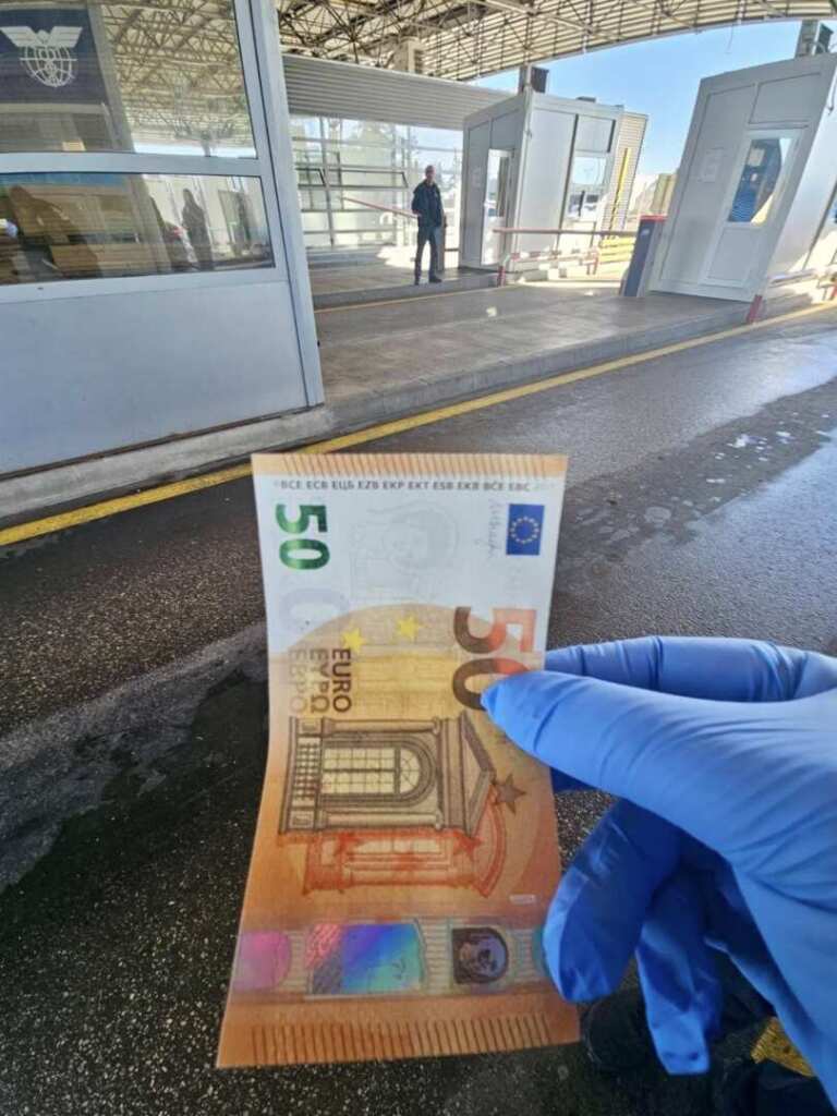 При извършения контрол у водача са открити десетки банкноти с номинал 50 и 200 евро, както и 100-доларови банкноти, за които има данни, че са подправени.