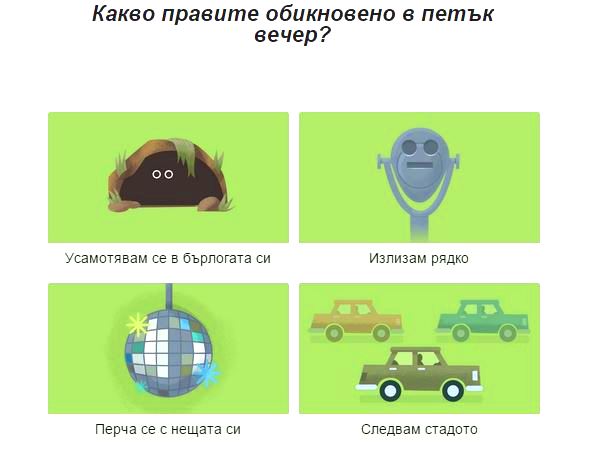 Тазгодишният Doodle води към забавен въпросник с картинки. В края на анкетата, най-голямата търсачка в света определя на кое животно приличате. Google има традиция да използва различни лога, с които да отбелязва значими дати, които понякога са свързани с празници, личности или общественозначими събития. Екипът на Google не пропуска и националните празници на десетки държави по света.