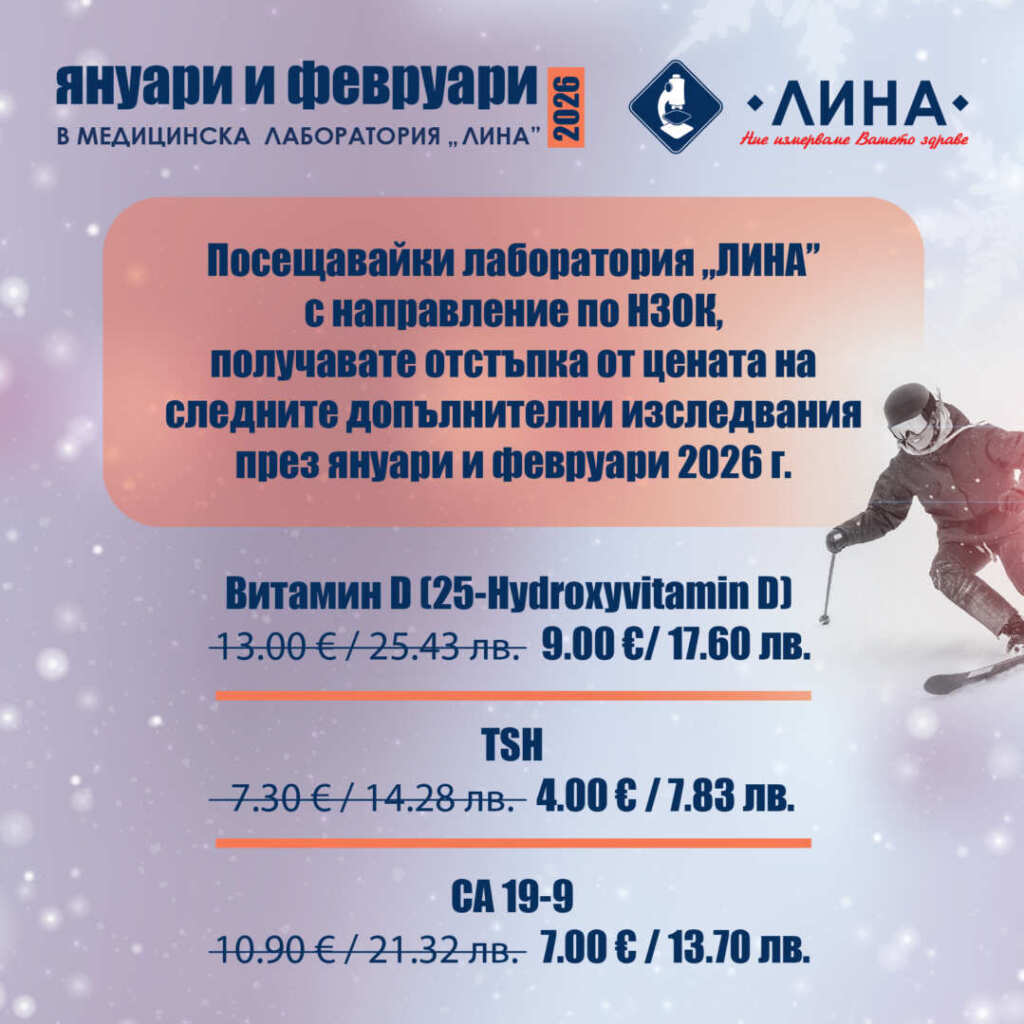 Всички пациенти, които се изследват с направление по Здравна каса в лаборатория „ЛИНА”, могат да използват отстъпка от цената на допълнителни анализи. През февруари 2026 г. те са следните: