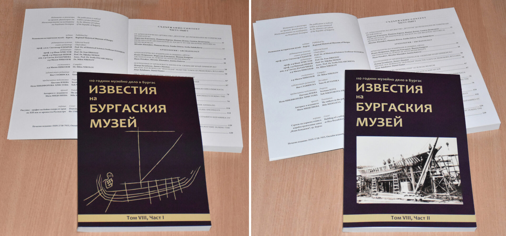 Преди броени дни излезе от печат сборникът ,,Известия на Бургаския музей – т. 8“, издаден по проект на музея, финансиран от Министерството на културата на Република България. Сборникът е посветен на 110 годишнината от изследователска и музейна работа на Бургаския музей. Изданието е двутомно, с общо над 600 стр. текст.