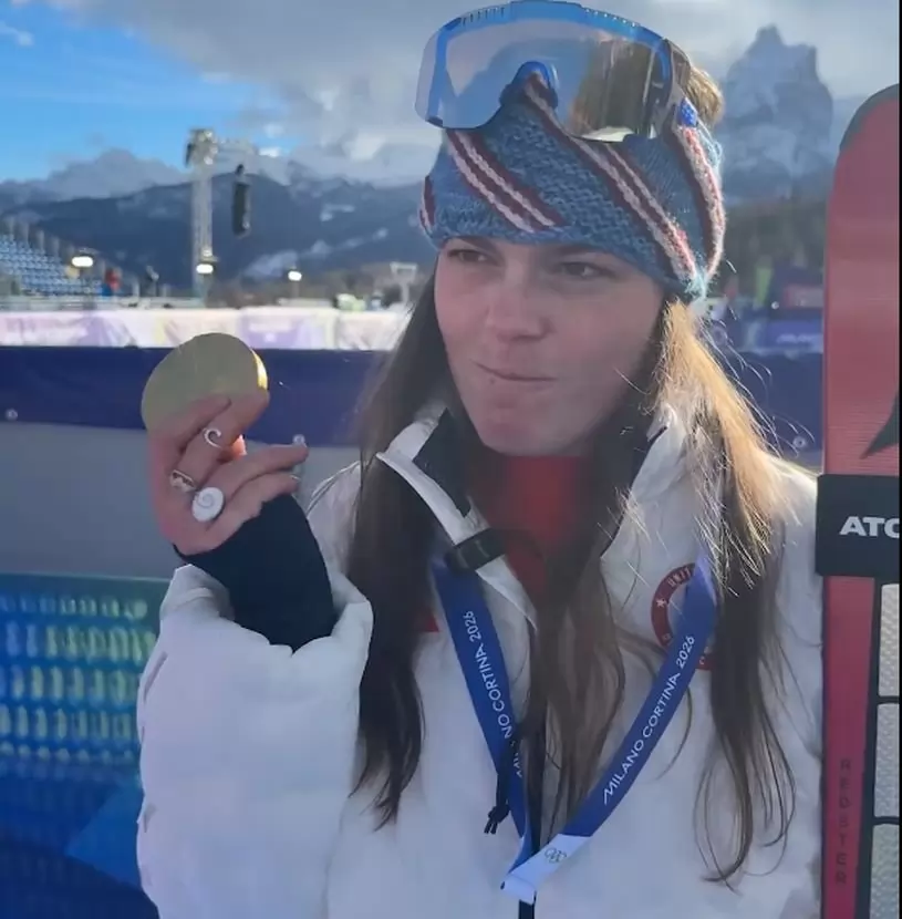 На пресконференцията след победата си в спускането при жените американската скиорка Брийзи Джонсън посъветва подгласничката си Ема Айхер: „Не скачай“. И показа на смаяната от тази реплика германка златния си медал, или по-скоро отделните му части.