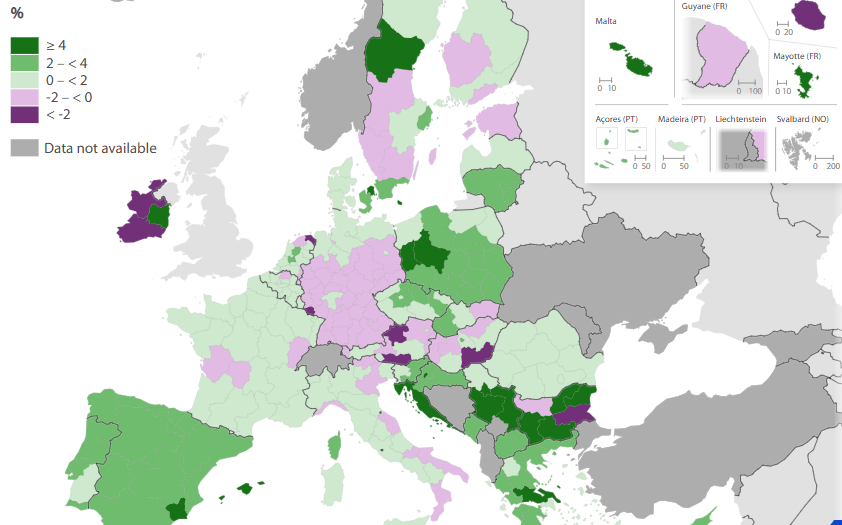 Докато повечето европейски региони отчитат растеж, Югоизточна България „светва в червено“ на икономическата карта на ЕС. Спадът е по-дълбок от този във всички останали засегнати региони, което поставя района в безпрецедентна позиция спрямо останалата част от Съюза.