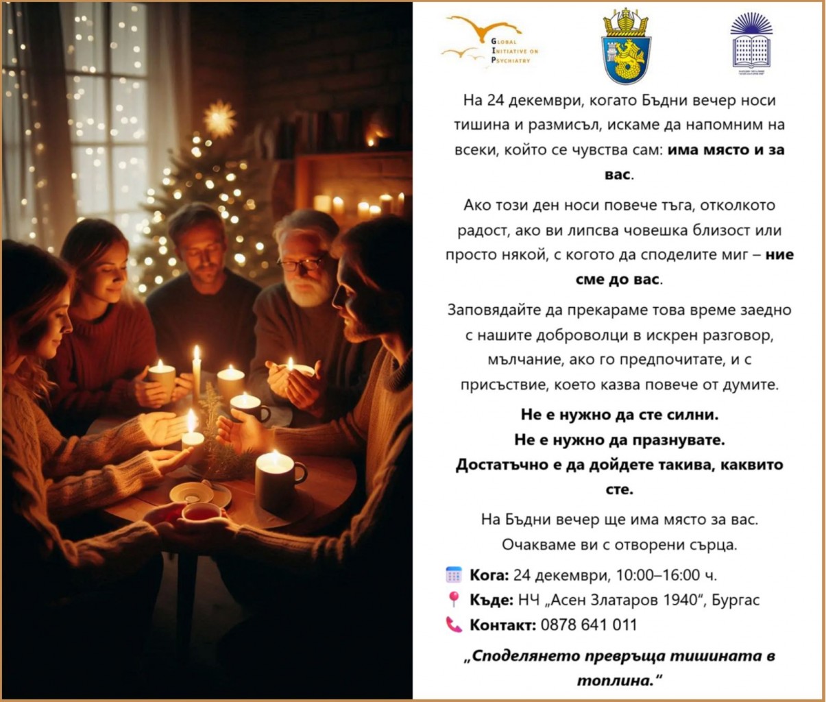 В навечерието на Бъдни вечер – 24 декември, Ви каним на празнична среща, посветена на споделеността, човешката близост и топлината на общуването.