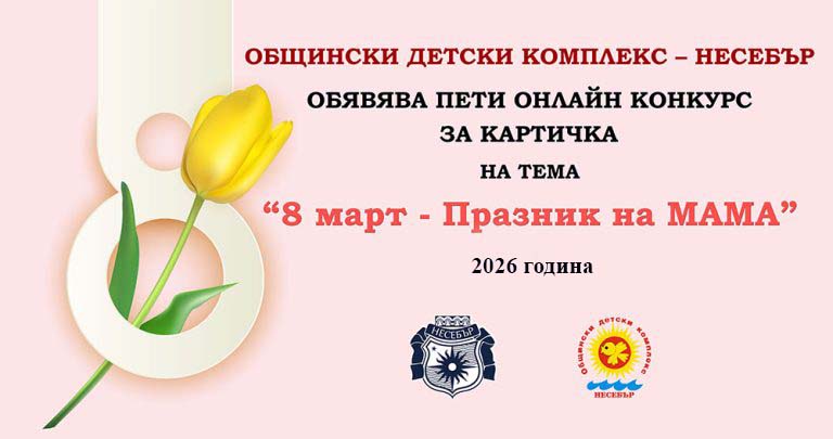 Община Несебър и Общински детски комплекс – Несебър обявяват шести онлайн конкурс за картичка на тема „8-ми март – Празник на мама“ – 2026 година. Конкурсът се организира по повод Международния ден на жената и в  него могат да участват ученици от цяла България на възраст от 7 до 19 години. Провежда се в два раздела: ръчно изработена картичка и  дигитална картичка.