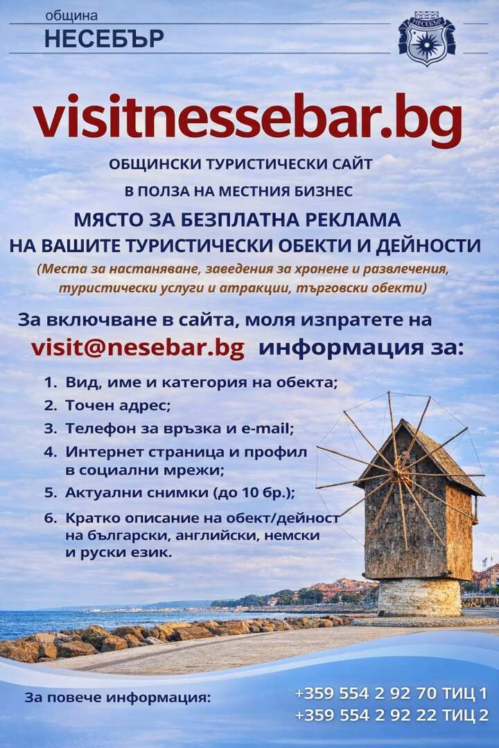 Община Несебър кани местния бизнес да се включат в официалния туристически портал visitnessebar.bg. Платформата предлага безплатна реклама на места за настаняване, заведения за хранене, атракции, услуги и търговски обекти – отлична възможност за популяризация, особено във връзка с предстоящото събитие Giro d’Italia.         За участие е необходимо да изпратите информация за обекта си на [email protected]. За повече информация последвайте посочения линк.          https://visitnessebar.bg/databg/32