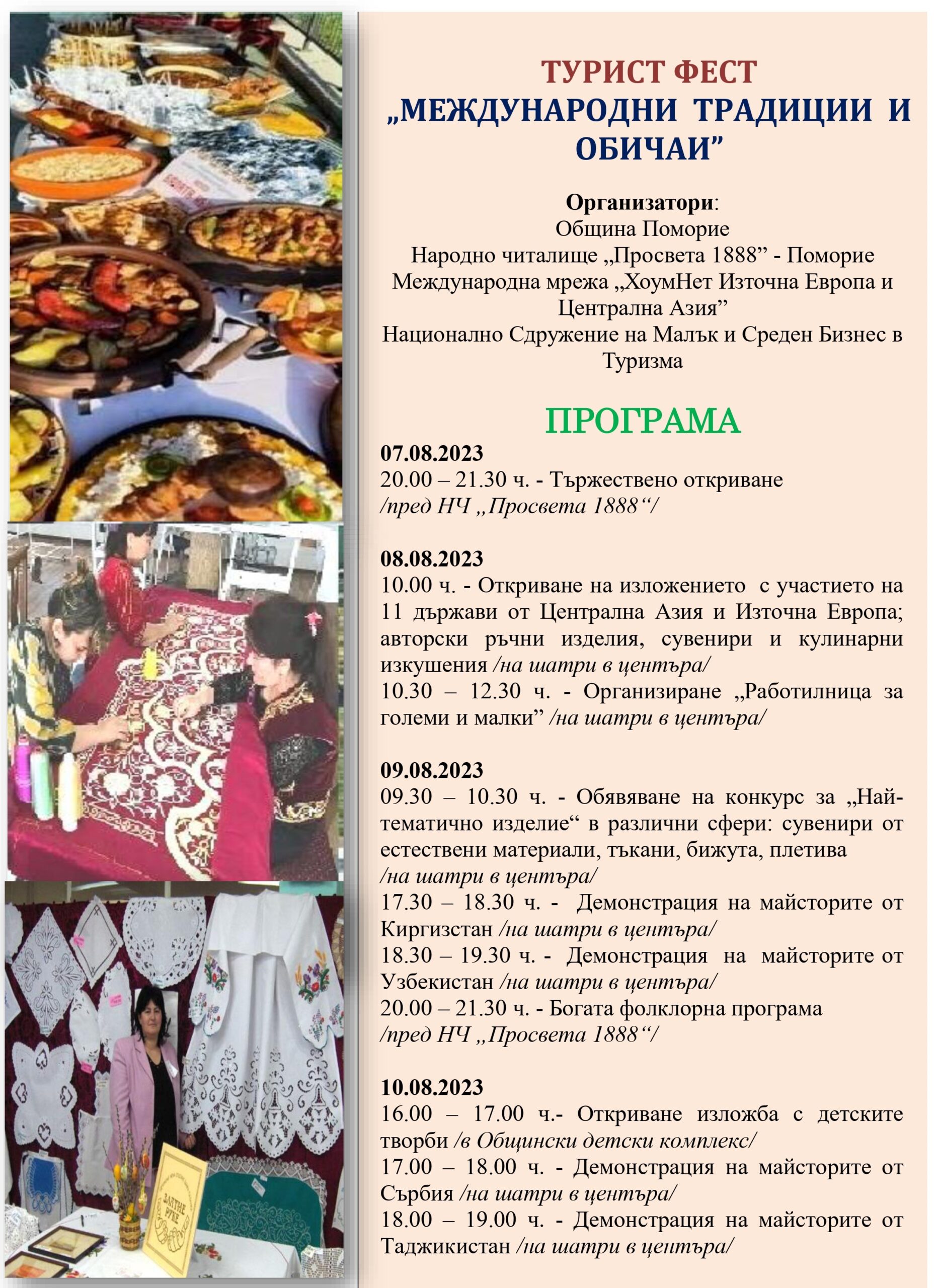 Международната организация „ХоумНет Източна Европа и Централна Азия“ и Националното сдружение на малкия и средния бизнес в туризма си партнират и създават нови възможности за взаимодействие в туристическия бизнес чрез културни и кулинарни събития, както и чрез дейности и прояви, способстващи за изграждане на национално корпоративен и регионален облик в бранша. С цел да се активират културно-тематичните ресурси и да се подпомогне сътрудничеството между отделните региони, от 7 до 10 август в центъра на Поморие ще се проведе Турист фест „Международни традиции и обичаи“.