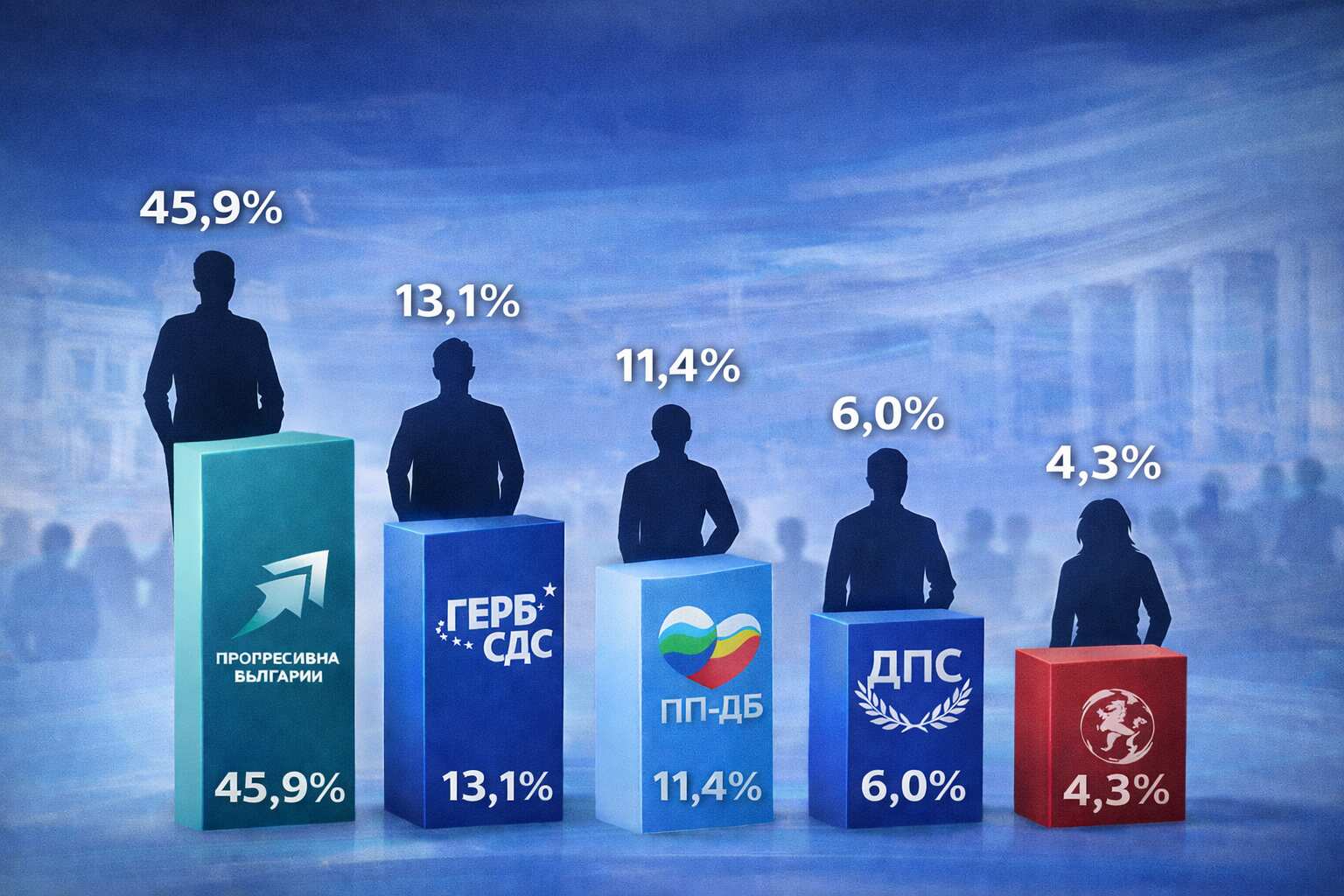 „Прогресивна България“ печели убедително предсрочните парламентарни избори с над 45% подкрепа, показват първите данни от паралелното преброяване на социологическите агенции „Тренд“ и „Мяра“.