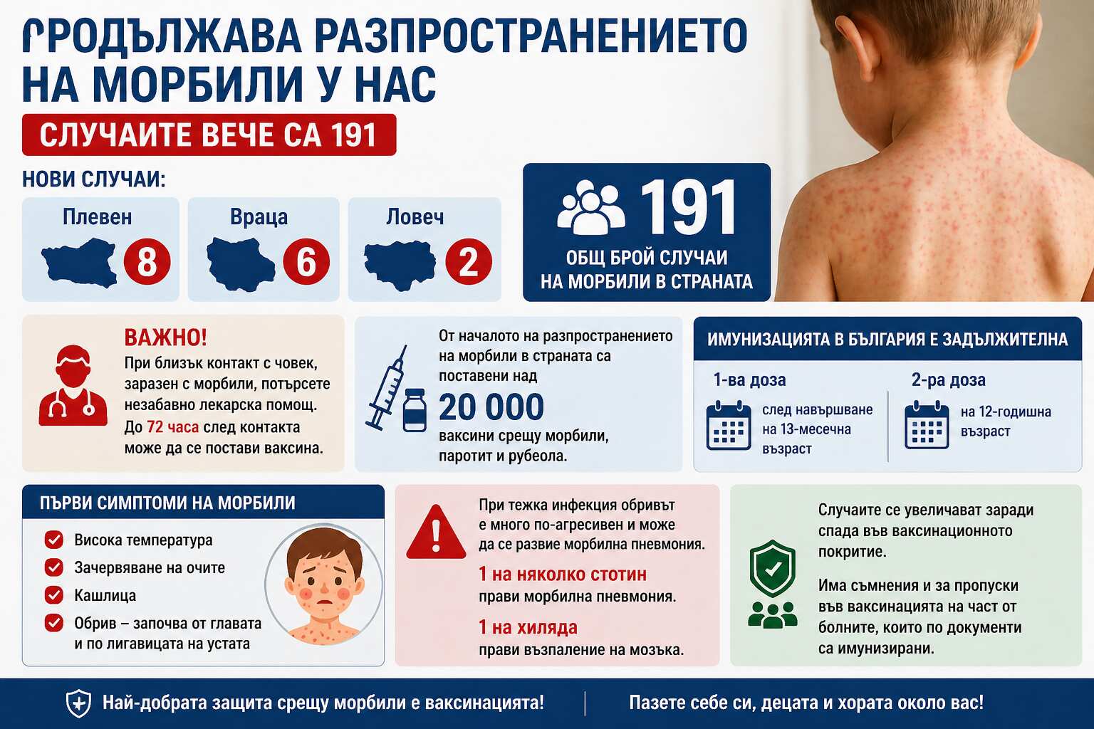 Продължава разпространението на морбили в България, като потвърдените случаи вече са 191. Най-новите заразени са регистрирани в областите Плевен, Враца и Ловеч, показват последните данни на здравните власти.