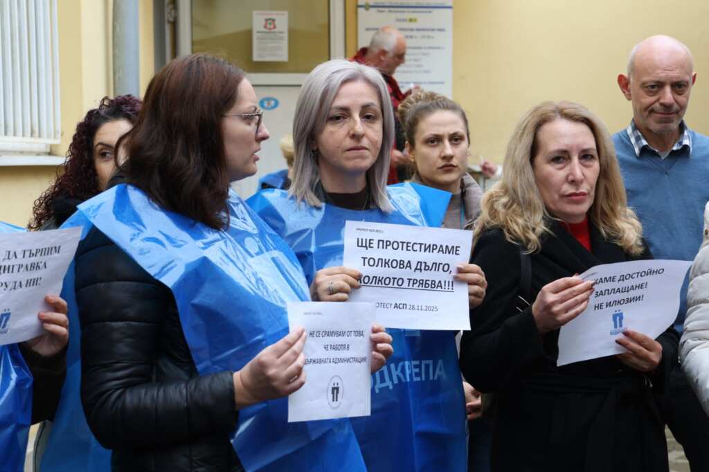 Заплатите са малко над минималните – около 1500–1600 лева. Няма как да оцелеем с тази инфлация. Работата не свършва в 17:00 – случаите ни следват и извън офиса.“ – посочиха протестиращи.