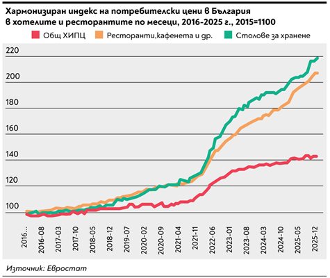 Всеки път, когато ресторантьорите искат данъчни облекчения, обновявам версия на тази графика. При 43% обща инфлация от 2015 г. насам ръстът на цените в ресторантите и кафенетата приближава 110% за същия период. Никакво увеличение на труд, ток или суровини не отговаря на над двоен ръст за 10 години – далеч над всичко останало в икономиката./24chasa.bg