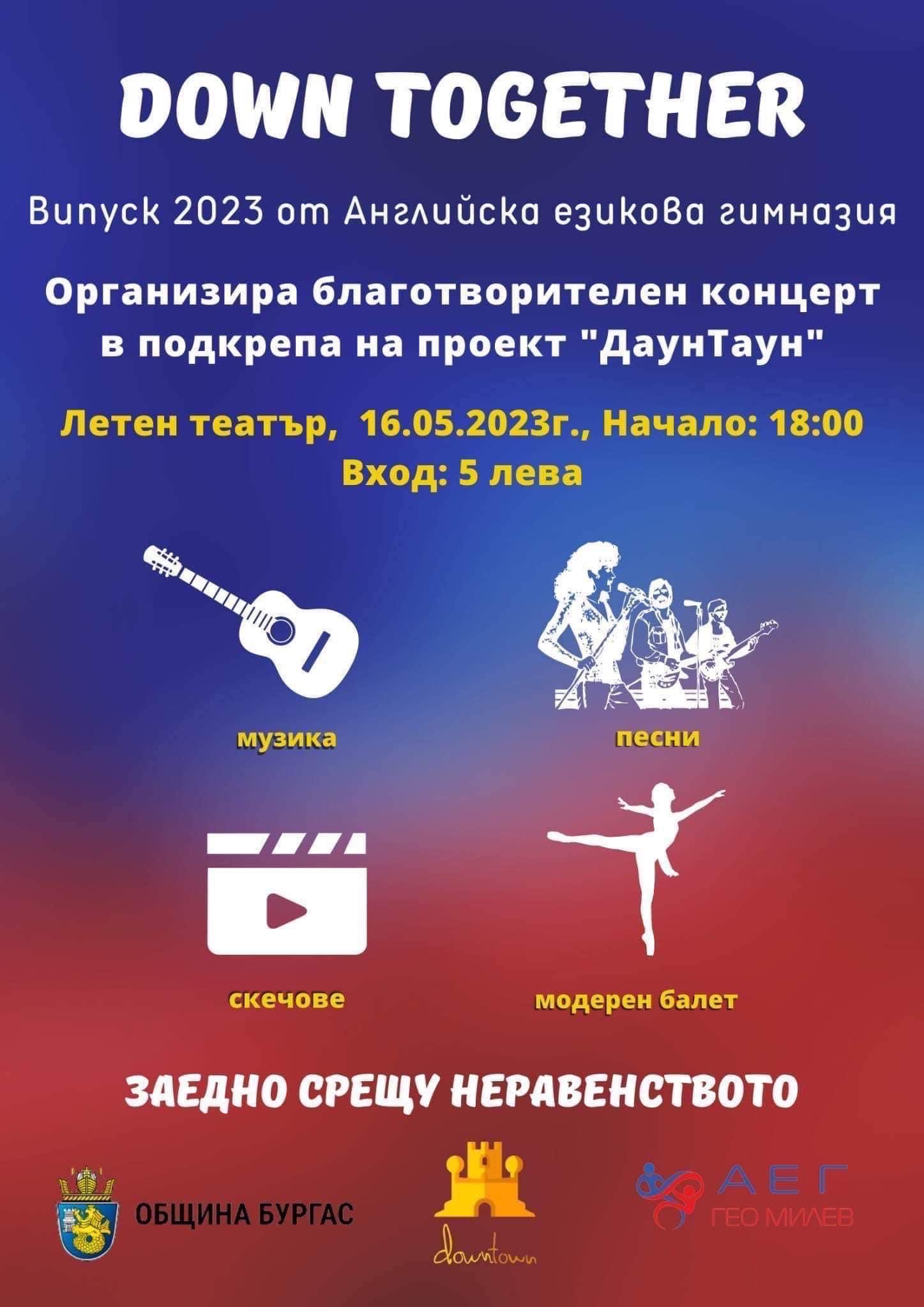 Спектакълът „Down Together” ще бъде представен на 16 май от 18 ч. в Летния театър. Билетите са с цена 5 лв. за брой и могат да бъдат закупени в деня на събитието от 17:30 часа от касата на Летния театър. Випуск 2023 на АЕГ „Гео Милев“ кани всички жители и гости на града да станат част от „Down Together” и заедно да сътворят поредното малко чудо за „слънчевите деца“ на Бургас.