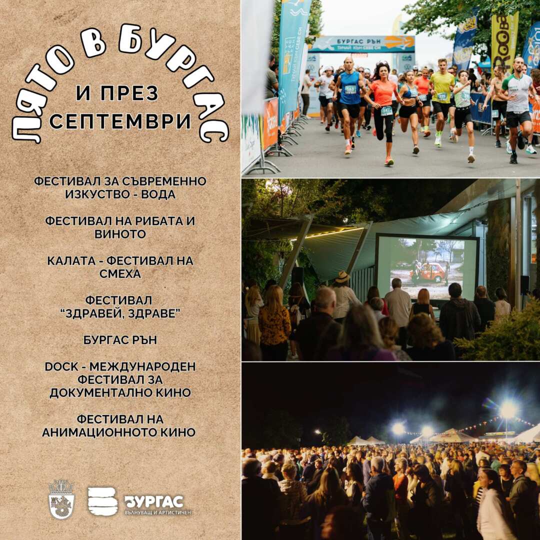 Не бързайте да прибирате летните дрехи и да казвате „Чао“ на морето. Септември е един от любимите месеци за почивка в Бургас с много слънце и с още събития в културния и спортен календар на Общината. И тази година програмата е запълнена с фестивали, сред които и нови предложения, а любителите на адреналина също отсега могат да правят планове кога да изберат морския град за почивка и спорт! Всички събития от културния календар на Община подкрепят кандидатурата на Бургас за Европейска столица на културата 2032.