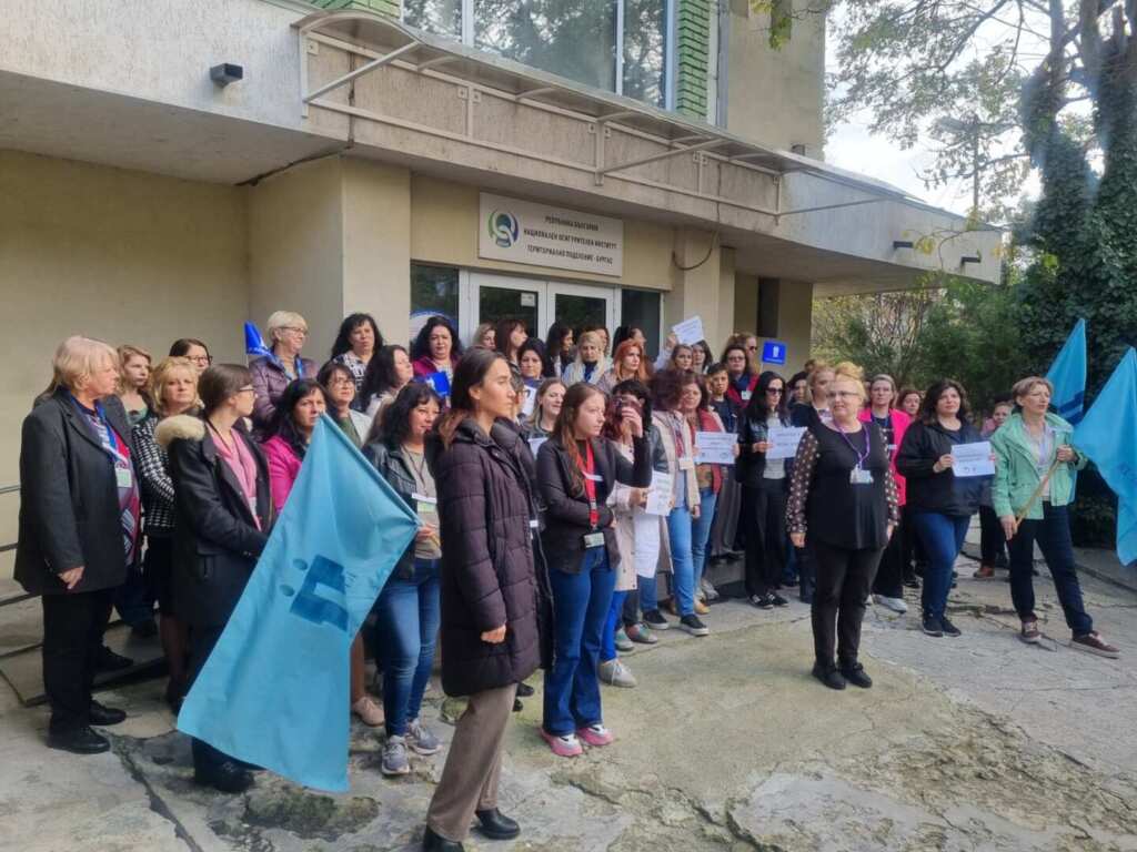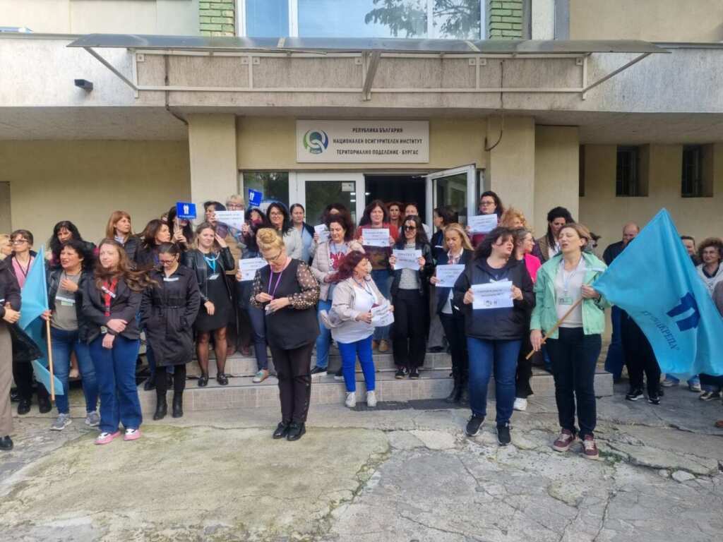 Служители на НОИ–Бургас протестираха с искане за минимум 20% повишение на заплатите в Бюджет 2026, съобщи Спаска Димитрова от КТ „Подкрепа“. По думите ѝ натовареността и честата работа извън работно време оправдават подобно увеличение. Тя определи като несправедлив негативния обществен образ на служителите и подчерта, че те сами плащат осигуровките си.