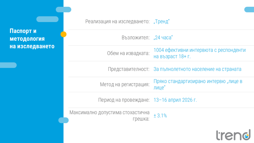 Проучването е на социологическа агенция „Тренд“ по поръчка на „24 часа“. Реализирано е в периода 13–16 април 2026 г. чрез пряко стандартизирано интервю „лице в лице“ сред 1004 пълнолетни граждани. Максимално допустимата статистическа грешка е ±3,1%.
