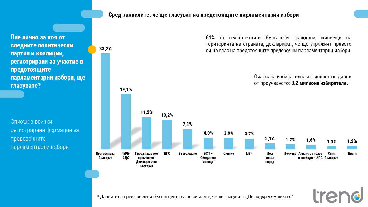Лидер остава „Прогресивна България“ с 33,2% подкрепа сред заявилите, че ще гласуват. На второ място се нарежда коалицията ГЕРБ-СДС с 19,1%.