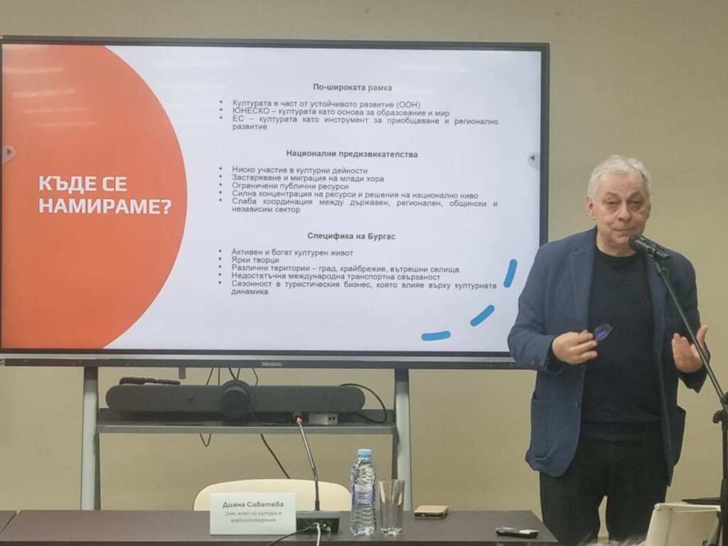 Проектът на стратегията беше представен от д-р Любомир Кутин, който запозна присъстващите с основните акценти в документа, както и с анализа на състоянието на културната система в Бургас и възможностите за нейното развитие през следващото десетилетие.