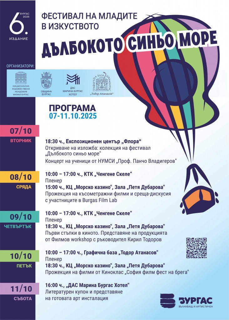 От 7 до 11 октомври в Бургас ще се проведе шестото издание на Фестивала на младите в изкуството „Дълбокото синьо море“. Събитието се организира от Националната художествена академия и Община Бургас, със съдействието на ДАС Марина Бургас Хотел и е по идея на проф. Светозар Бенчев, директор на НХА – Филиал Бургас.