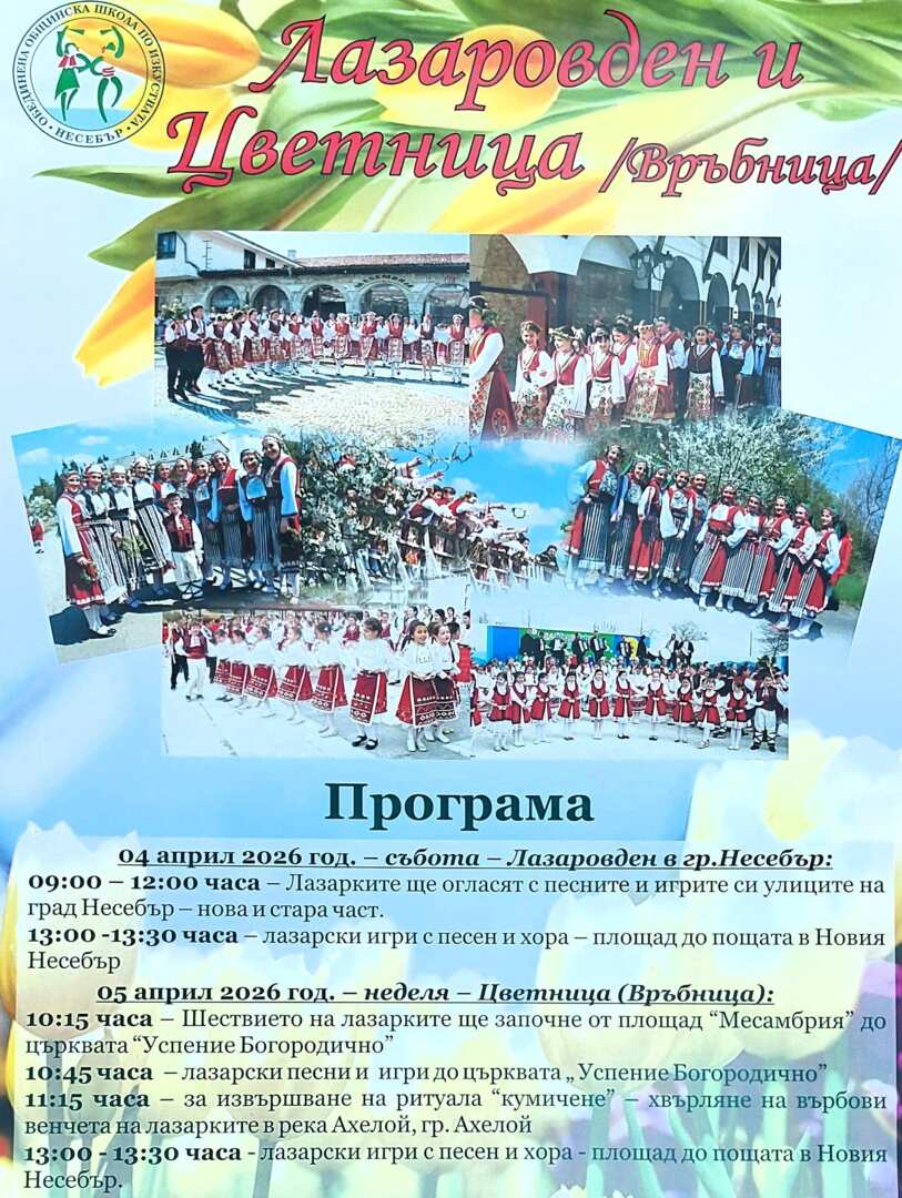 Община Несебър кани всички жители и гости на града да станат част от празничните събития и да съпреживеят българските традиции, свързани с Лазаровден и Цветница.