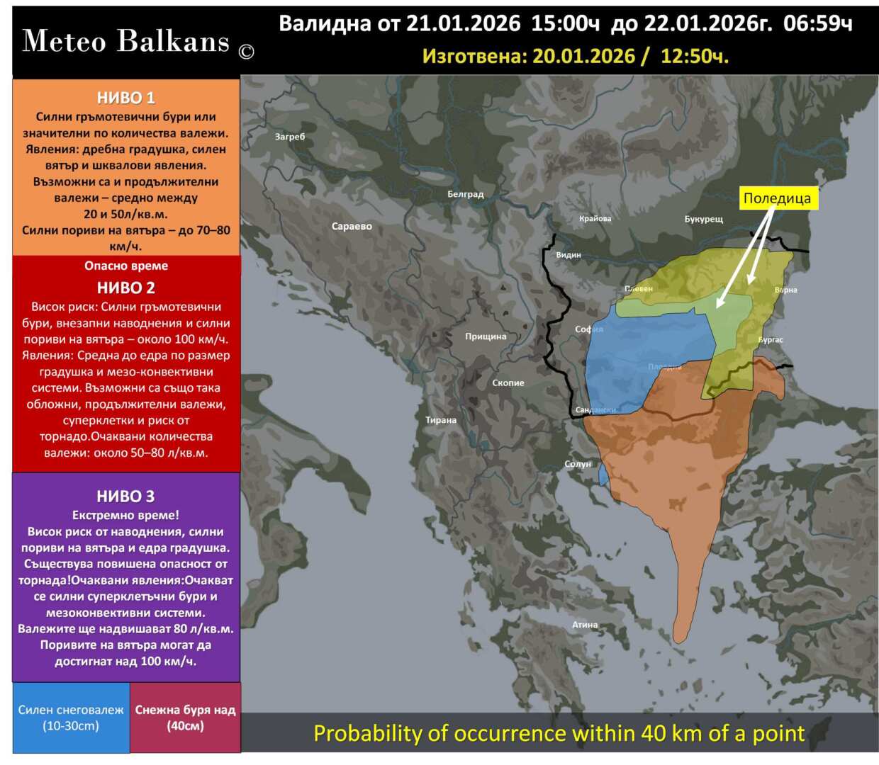 През деня в сряда, около и след обяд, започналото от югозапад увеличение на облачността ще обхване почти цялата страна. След обяд и през нощта срещу четвъртък се очакват валежи от дъжд и сняг, като от сняг ще са валежите по високите полета на Южна Централна България и в планинските райони, а от дъжд – в Горнотракийската низина и по Южното Черноморие. В Централна Северна България и Югоизточна България се очакват валежи от дъжд, като там ще има и по-висок риск от поледици!