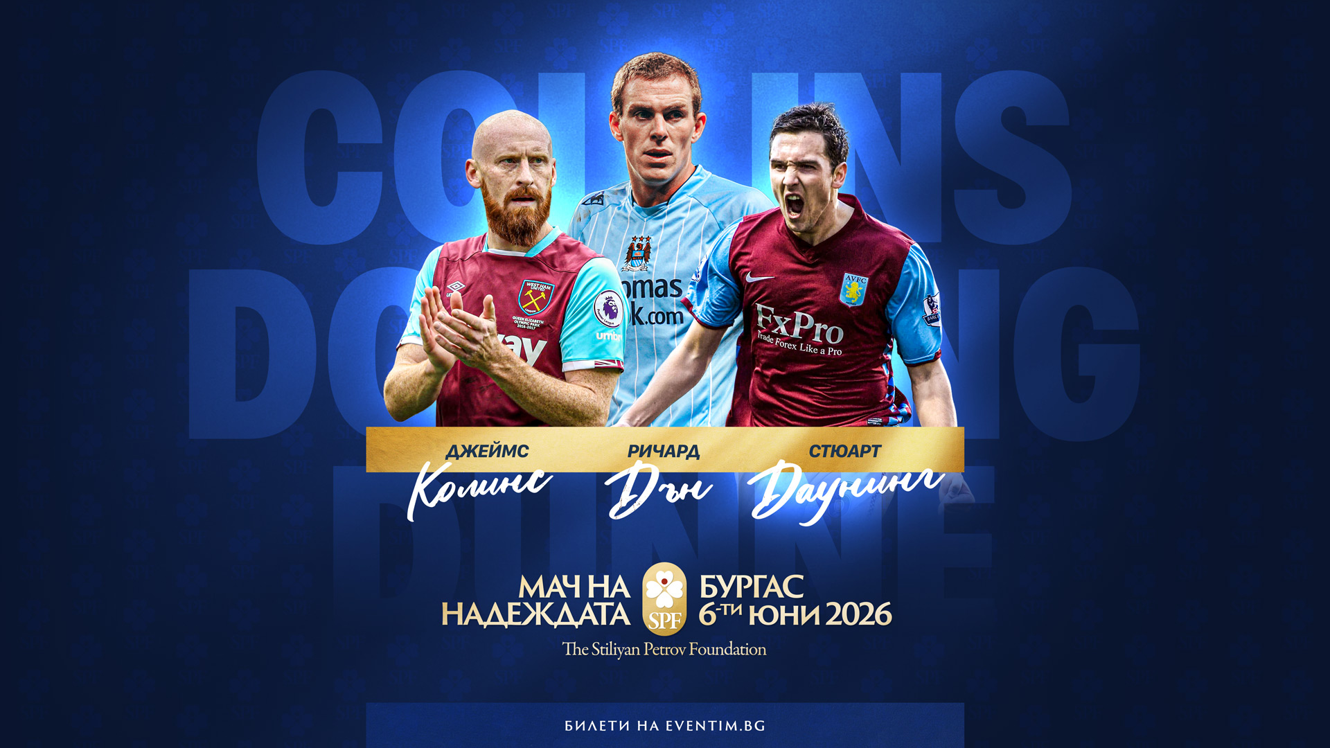 Нови три големи имена от английския футбол се присъединяват към благотворителния „Мач на надеждата“, който ще се проведе на 6 юни 2026 г. на стадион „Лазур“ в Бургас. Фондация „Стилиян Петров“ обяви, че в звездния отбор на чуждестранните футболисти ще играят Джеймс Колинс, Стюърт Даунинг и Ричард Дън.